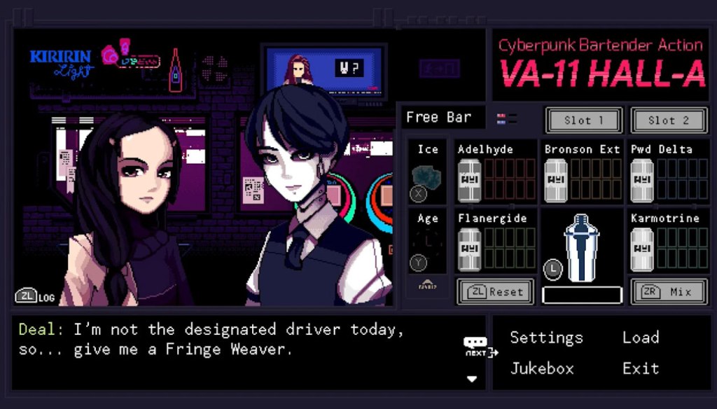 I suppose I should address what is, at least for me, the elephant in the room. I am reviewing this game after the similarly-themed The Red Strings Club, a game that is also about a bartender in a cyber-punk setting, and so my view of this game may be shaded by how impressed I was with that one – after the absolutely stellar writing and plot of Red Strings Club, as well as its inventive bartending elements, it feels like a step backward to be playing VA-11 Hall-A. However, that’s not to say that this game has nothing to offer – it has a charm all its own, and fans of cyberpunk should be delighted that they have two solid games to choose from in this genre this year.
