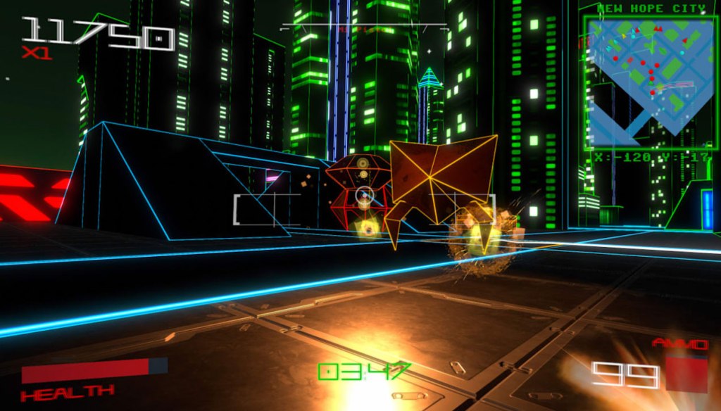 Vektor Wars is a First-Person Shooter with a distinctive look modeled after classic vector-based videogames that many will likely associate with Tempest or Tron.