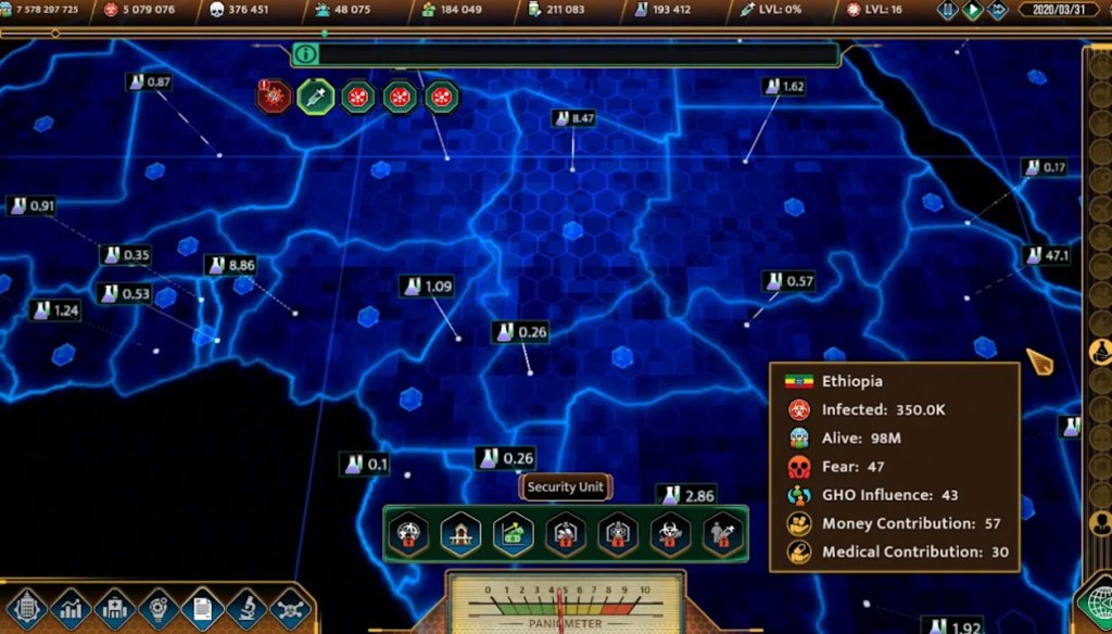 tl;dr – Virus: The Outbreak is a Simulation-style game where players take the role of the Global Health Organization in the midst of an international pandemic, directing response and recovery efforts and trying to head off a global catastrophe. Unfortunately, this game is overly-complicated and suffers from some frustrating performance issues that make even navigating the game’s menus (you know, the main thing you do in this game) a tedious chore. Some may find this game’s wealth of options enticing, but most players interested in this sort of game have multiple options they’re likely to find more accessible and enjoyable.