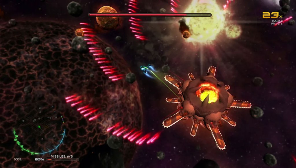You know how I said that these enemies sometimes dash themselves on asteroids in their attempts to get at you? Replace “sometimes” with “frequently”. Often, enemies don’t even seem to realize these objects are even there, opting to try to fly through them to get to you on the other side, only to smash themselves to pieces in the attempt. When you realize this, you’ll find yourself staking out a spot behind a sufficiently large one of these asteroids, which will not only shield you from attacks but take out a large portion of the enemies stalking you as well.