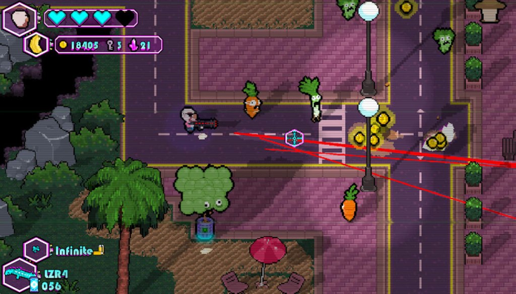 As one might expect from a setup like that, this is a game that doesn’t take itself too seriously, and the pixel art presentation does a good job of ensuring that the world and its characters are full of personality, with some nice animation and great expressions for all of its characters, all with an 80s retro-style flair because why not. This is backed by a really catchy chiptune soundtrack, and combat is filled with the fun noises of the various enemies (carrots, in particular, make really amusing noises when they spin at you). Without a doubt this game’s presentation is one of its finest points, and those who buy the game for its odd premise hoping for it to match that sense of humor will not be disappointed.