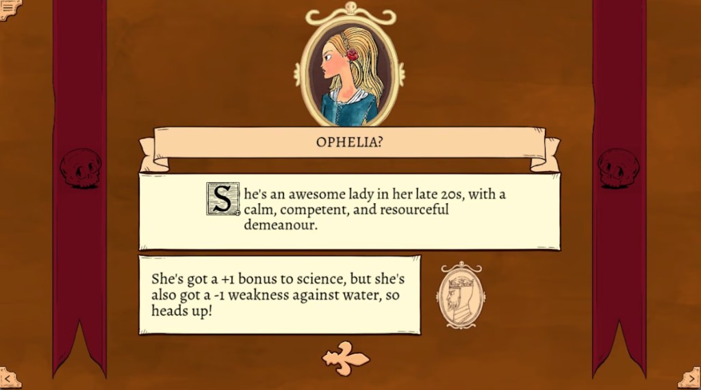 The tone and humor here are thanks to a combination of some witty writing and some excellent line delivery by this game’s voiced narrator Ryan North (of Dinosaur Comics fame), as well as some fun directions players can opt to take the story. In my first playthrough, the story starred Hamlet’s girlfriend Ophelia, who responded to Hamlet’s declarations of seeing his father’s ghost by gently convincing Hamlet that ghosts aren’t real, ending with Ophelia and Hamlet living comfortably together after turning a tidy profit when Ophelia invents indoor heating. In my second playthrough, Ophelia has a conversation with Hamlet and the ghost and convinces them that killing Claudius to avenge the king’s murder would be counter-productive, and everyone’s interests would be much better-served if Claudius was properly indicted in Denmark’s legal system.