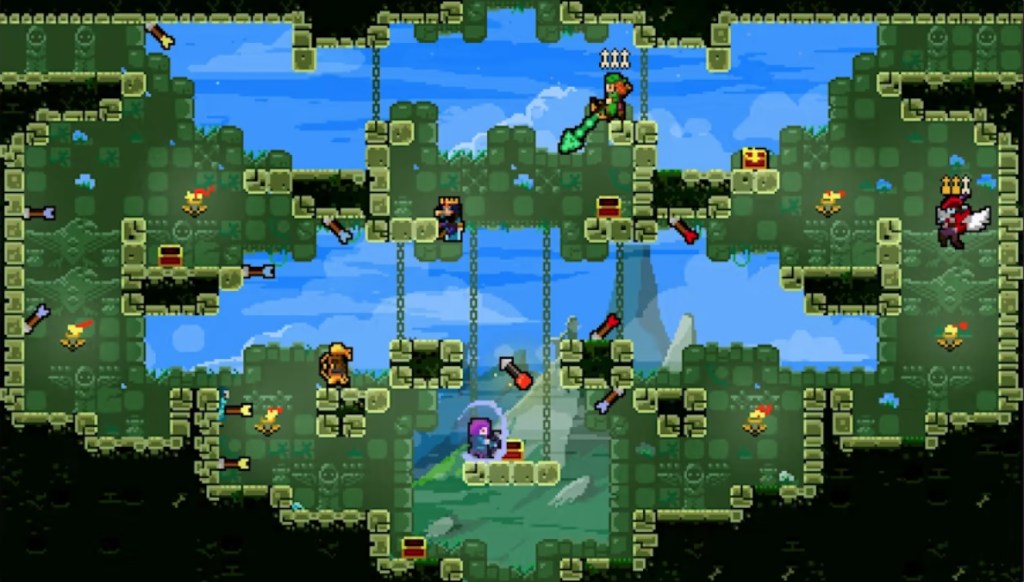 There’s a lot of nuance to the gameplay here, too. Players can fight using arrows, or can hop on an enemy with a Mario-style jump to take them out. There are different types of arrows, and the game’s different levels each offer different challenges that set them apart, as well as unique enemies in the game’s campaign mode. Also, players can dash in mid-air, which both gives them extra maneuverability and can also allow them to catch arrows that would have killed them.