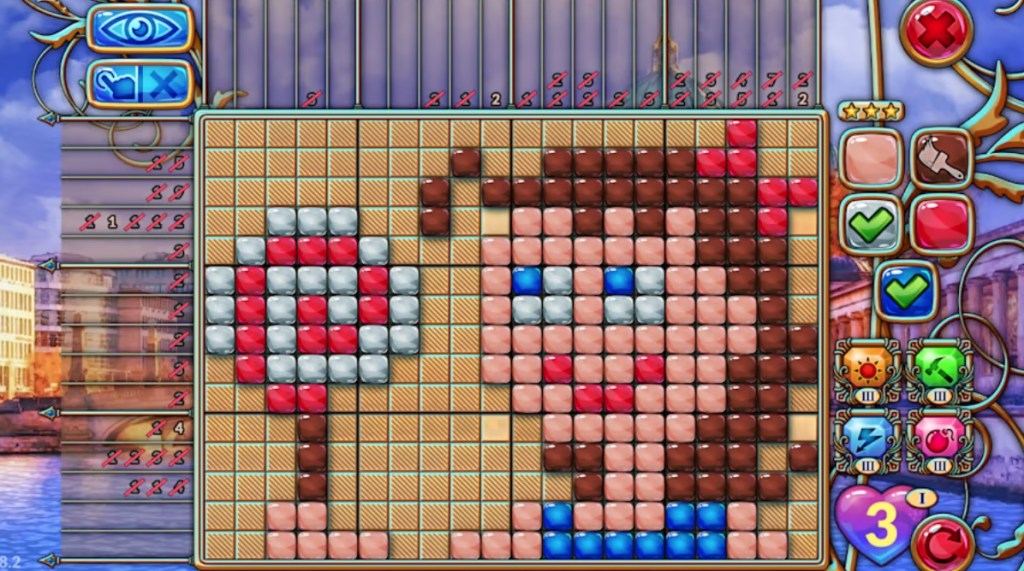 So then, the question is, how does the gameplay stack up? Well, firstly, while this game does present players with color picross levels, the way they’re done is a bit different than they’re usually done. Rather than having the numbers at the side and top indicate how many of each color is in that space, these numbers only show the number for the color currently selected. This makes for a challenge that’s not necessarily harder or easier than seeing everything at once, but different, with players having to go back and forth between different colors to see how that color’s board has changed now that you’ve filled in squares from other colors. It takes some getting used to, but it works very well, all things considered.