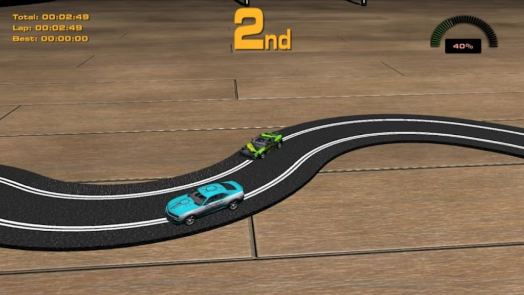 The gameplay here is simple, as you would expect from Slot Car Racing – just hold a button to go, or… well, or don’t do that. Unfortunately, this game manages to screw up even that simple formula by failing to give any sort of decent indication when your car will go off the track. You would think that the track builder might be this game’s saving grace, but it’s sadly extremely limited, giving players less than a dozen different pieces to use.