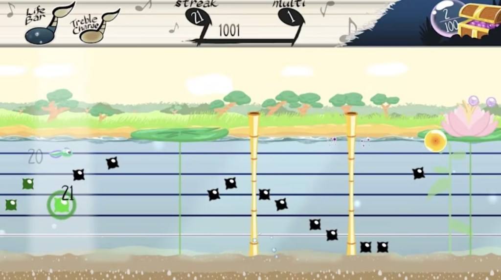 Tadpole Treble is a family-friendly Music-Rhythm game first released on PC and Wii U in 2016, now ported to Nintendo Switch in this “Encore” version with expanded content including a new stage, making this the definitive version of the game. In this game, players take the role of a tadpole swimming in stages arranged like sheet music and must dodge obstacles while collecting pickups.
