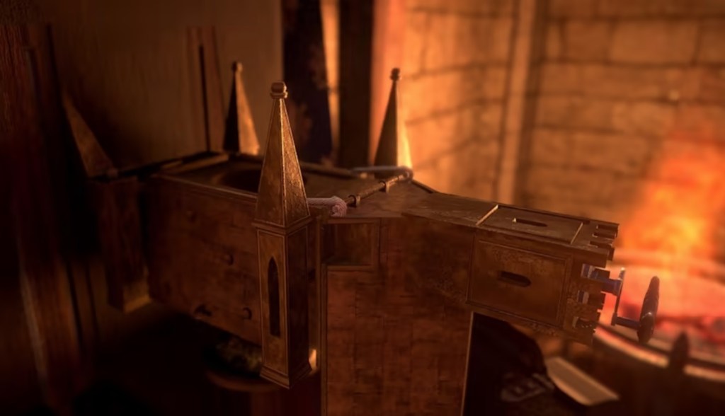 The gameplay itself here involves you interacting with countless devices strewn throughout Da Vinci’s workshop to find a way to move further on. These devices are intricately rendered in wonderful detail, and one of the great delights of this game is encountering a new device and uncovering its secrets, or finding a hidden switch and seeing one of these contraptions unfold into some new configuration.