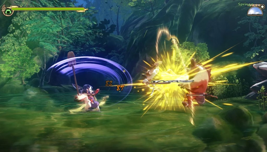 While this combat system is mostly fantastic, it does also make for one of the game’s bigger flaws, as Sakuna can get “locked in” to facing a direction, making it difficult to attack behind her. This can be especially frustrating when a combo has her flinging herself into the air, only to discover that you’ve gone past your target, or quickly getting behind your opponent, only for them to turn around faster than you do – something you intended to get the drop on an enemy can all too easily help them to get the drop on you.