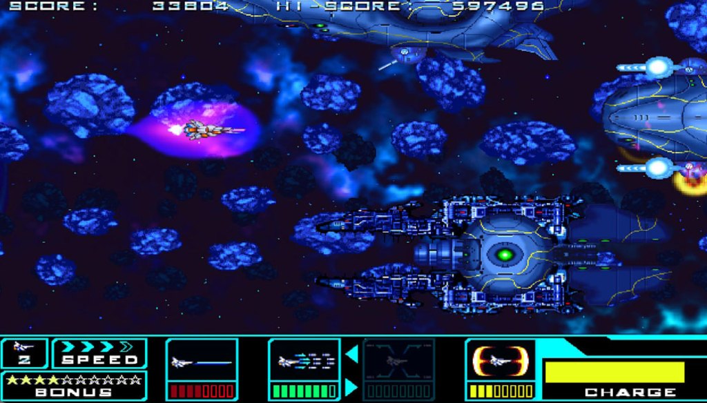 Satazius Next is a Compilation of two Shmup games, Satazius, originally released on PC in 2011, and its remake, Satazius Next, apparently exclusive to this release on Nintendo Switch in 2020. These games are Shmups that have a similar feel to Gradius, albeit with a somewhat different sort of upgrade system.