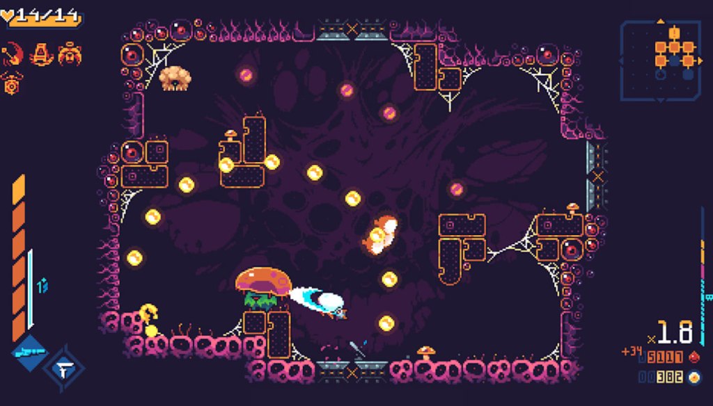 ScourgeBringer uses an appealing pixel art art style for its visuals, with particularly good animation for its central heroine. This is backed by an energetic rock-inspired soundtrack that works well enough to highlight the intense action of the game, but isn’t especially memorable in its own right.