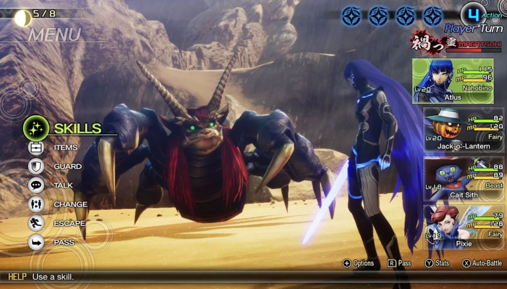 Much as in prior SMT games, at any time during combat with normal enemies, players can opt to talk to a monster to try to coerce them into joining your side. This often takes the form of a nonsensical multiple-choice question you’ll have to guess at based on the monster’s personality, followed by a requested donation of money, health, or an item in your inventory. Sometimes, monsters will be in a good mood (based on an in-game lunar cycle), letting you skip the Q&A and possibly giving you a discount on their hiring fee.