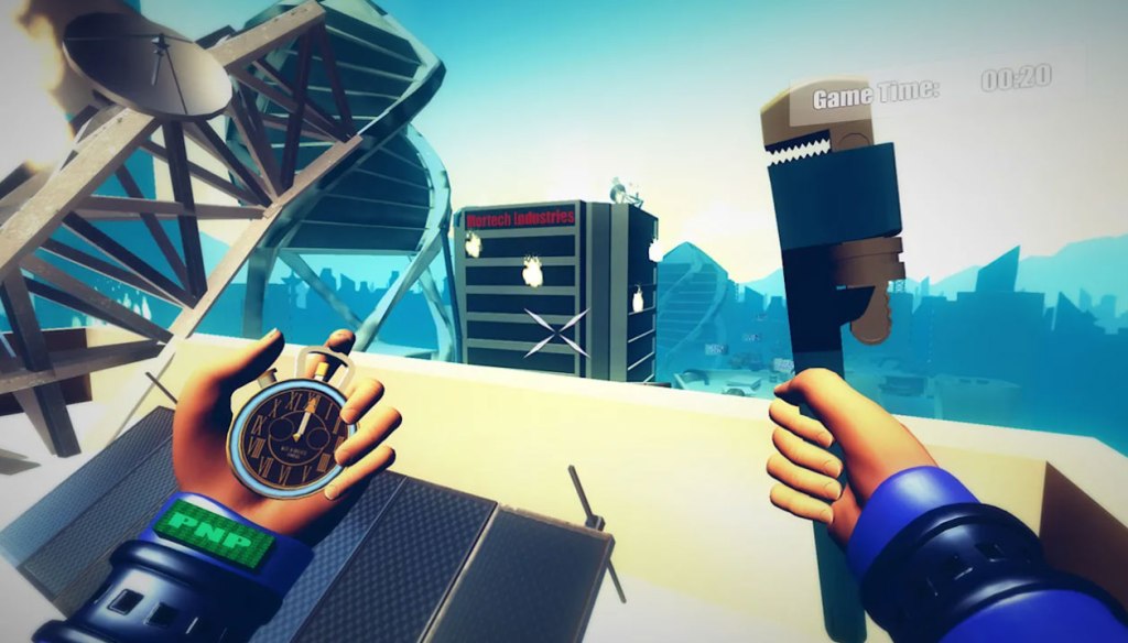 SkyTime is a First-Person Perspective Platformer, where the focus is all on speeding through tricky levels while getting shot at by turrets. To help you on your journey, you’ll have a time-manipulating watch and a remote-control boomerang wrench… I swear I did not just make that up.