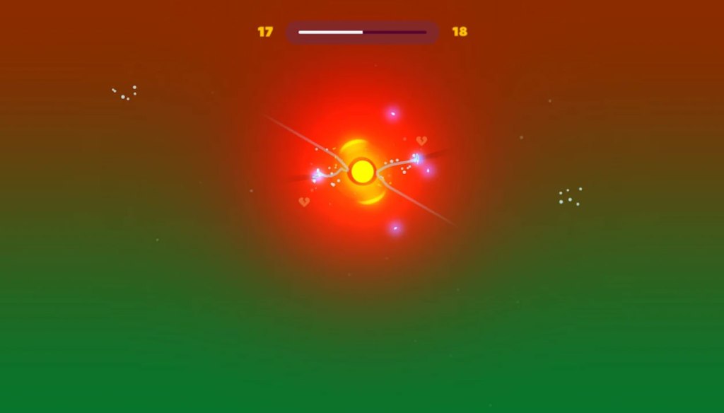 As for the game itself, I’ll say that the tight economy of design here isn’t limited to the game’s visuals. Solar Blast has players interacting with the game in one way and one way only – the direction players have a 360-degree shield facing. Yet the game manages to keep the gameplay fresh and varied using this single mechanic. Players have to fend off various projectiles, including some that proceed directly to target, some that fall into an orbit before descending, and even some that must be batted away with the shield like one would bat away a baseball with a bat. These objects are all affected by the game’s physics, meaning that players can even use the shield to bat one object into another, if they can manage the timing, angle, and speed correctly (or, more often, this may happen simply due to random chance).