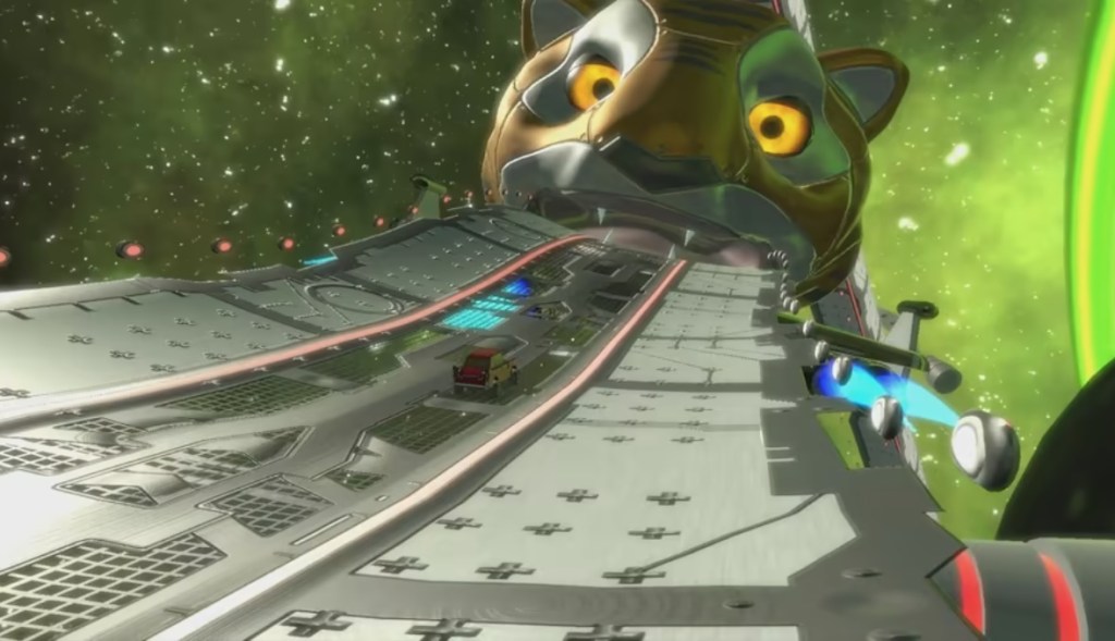 The visuals look okay on a technical level, but aesthetically it’s a really odd mix of generic old-fashioned vehicles, surreal spacey visuals, and… well, the giant cartoony animal head.