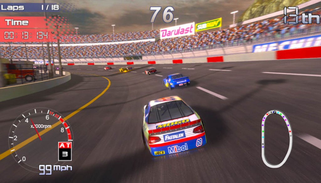 tl;dr – Speedway Racing is an Arcade Racing game with NASCAR-style racing events. The game mixes some surprisingly good presentation elements with some bad ones and some that are outright bizarre. However, even the good elements here are hard to appreciate with this game’s terrible framerates, bad collision physics, and some really inexplicably awful design choices that make this game an ordeal to play.