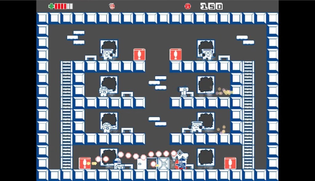 In terms of presentation, this game is rough, with simple pixel art visuals using a limited color palette. This unfortunately interferes with the gameplay too, making it difficult to tell at a glance which enemy is which, what’s an object that will block a bullet and what isn’t, and even making it easy to lose your own character in the fray. These visuals are backed by some pretty terrible chiptune music.