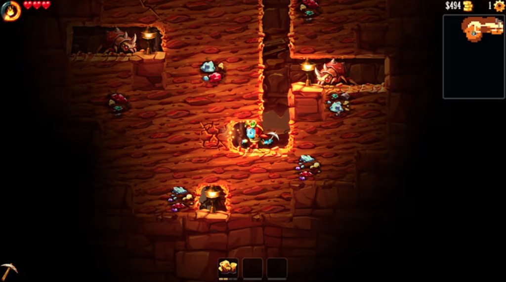 Like the first Steamworld Dig, this game has a lot in common with Terraria (which itself was like a 2D Minecraft), except Steamworld Dig’s scale is smaller, and instead of being an open world, it’s more of a Metroidvania, as each new area you progress to is gated off by an upgrade you need to acquire.
