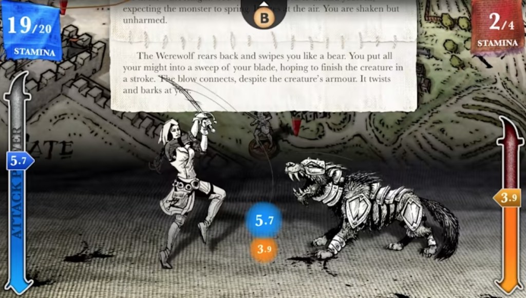 However, that’s not the only element at play here. Players do have various stats that their decisions affect, gold they can spend or save, and while players can often make choices in the story to avoid combat, the combat itself has players engaging with a combat system that essentially has players wagering against the enemy how much power to put into their attacks – too low, and the enemy’s attack may overpower yours, but use too much power and you may exhaust yourself for future turns. It’s a clever system that eschews the usual RPG combat mechanics of other games in the genre, though I wish there were more options here to bring it at least a little closer to traditional RPG-style combat..