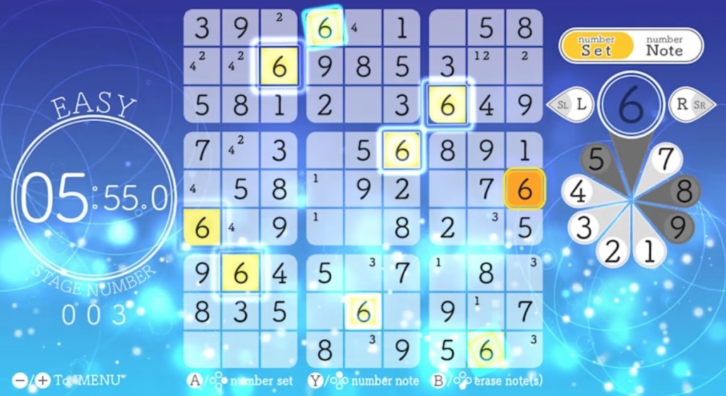 In most Sudoku games, you’ll be warned if you enter a duplicate number, but here, you’re prevented from doing so outright, and you’re also kept from making notes that conflict as well. On top of that, when you write in an answer, your notes are automatically cleaned up for you rather than making you do it. And when you shift from one number to another, all of the corresponding number and the corresponding notes you’ve made are highlighted, even greying out 3×3 sections that have that number in it.
