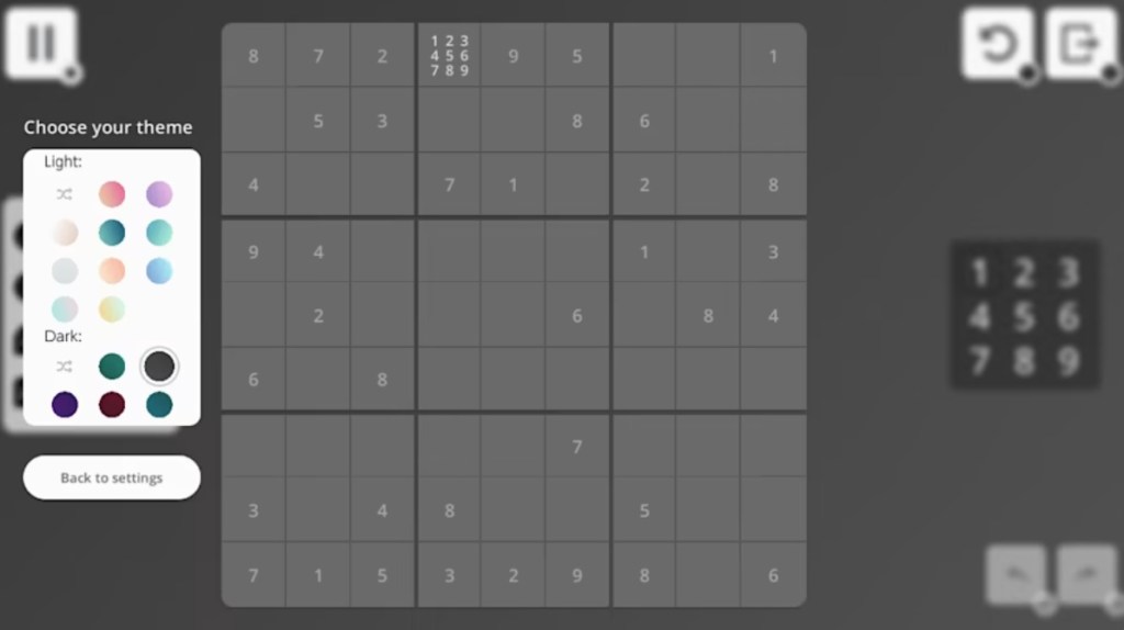 When it comes to options, Sudoku Universe has a wealth of display modes to choose from, separated into light and dark displays, and players can even have a random light or random dark display for each puzzle. Sadly, there’s no suck option for changing the music track, although I should say that the music here is appropriately calming, even if it repeats a bit more frequently than I’d like.