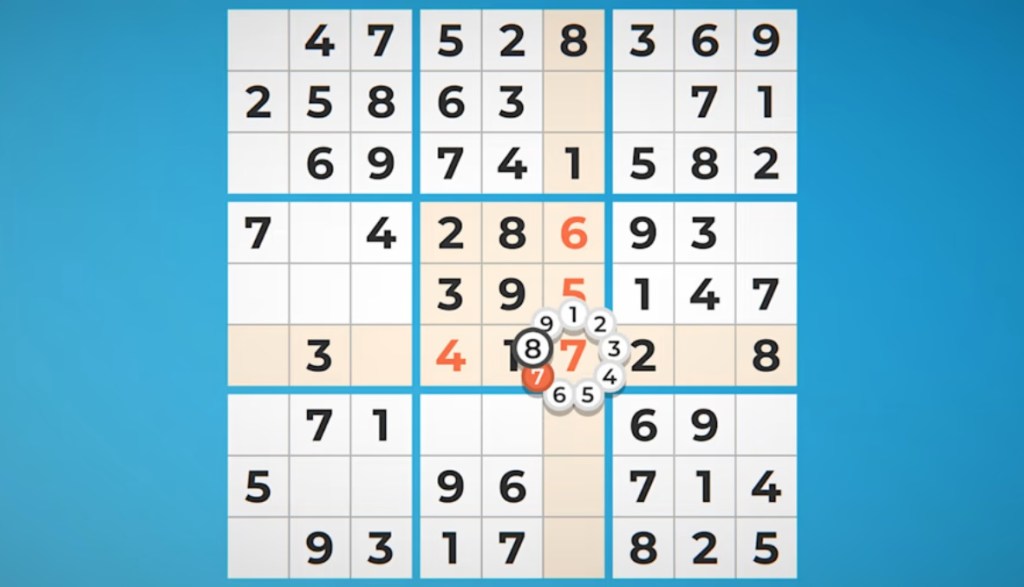 The presentation here is about as simple and straightforward as the features – it’s plain-looking, with big bold numbers on a white field on a blue background (with a half-dozen alternate color schemes available as well). Blue smaller numbers note where you’ve marked a cel but not finalized a choice, orange for when you’ve plugged in a choice, and red for when that choice conflicts with another cel. This is accompanied by a simple, plunky tune on strings that plays in the background.
