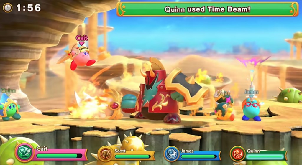 Well, it would, if this game were more addictive to play. Unfortunately (or fortunately, depending on your point of view), it kinda’… isn’t. Players can choose one of four different move sets for their Kirby to use (sword, hammer, magic rod, and a healing-focused flask), recruit and assign 3 other bots or friends, and then the boss battle commences with a lot of repetitive button-mashing.