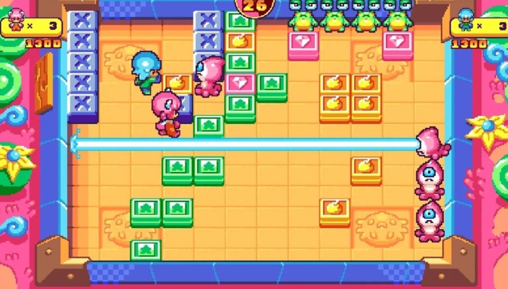 The core gameplay itself here is quite good too, with players pushing sliding blocks to squish enemies that move around the area, with different enemies having different movement and attack patterns. Pushing a block directly into an adjacent block will remove the block completely, and phishing a block into a line of three blocks of a matching color will clear them and create a bonus item – either a bomb that can harm enemies in a 3×3 area, a liftable block that can be put down wherever you like, or a diamond that adds bonus points to your score.