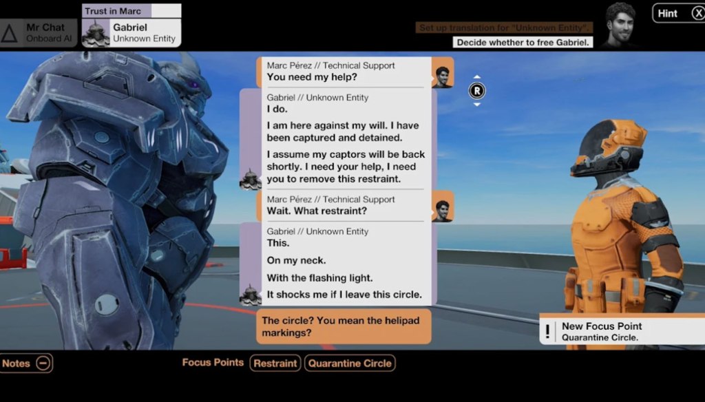 As with Subsurface Circular, the entire game of Quarantine Circular plays out in text conversations between the characters, with the detailed characters themselves standing around looking at each other in a static environment. Where this made sense in Subsurface, since the characters were all robots, it also makes sense here, as all of the characters save from the alien are wearing futuristic hazmat suits that obscure their faces. The alien itself is particularly detailed, with an mouth that has numerous flaps that animate when it’s… breathing, I’m guessing? This movement doesn’t correspond with talking, but again, this makes sense – one can only guess how the technology enabling communication with this creature is making that happen. While we’re on the topic of presentation, the music here is all solid, and does a good job of conveying the weight of this situation.