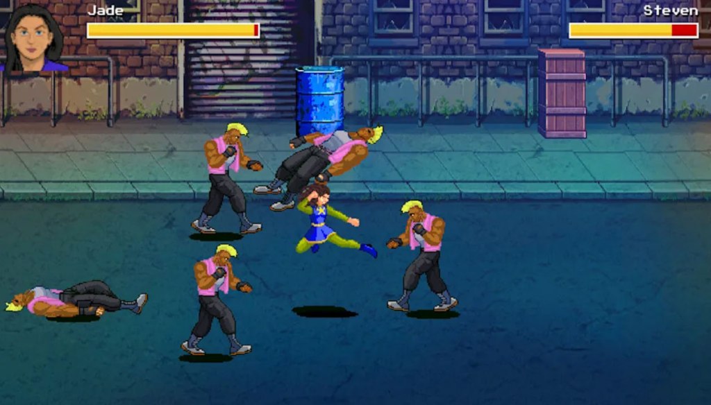 Even if you want to find some nuance to the combat here (and why bother?), there’s none to be found. Just a three-hit punch combo, a kick, a block, a jump, a jump kick, and one-use knives you can pick up and throw (held knives appear to float above your hand, oddly). That’s it – no running, no special attacks, no grapple, no melee weapons. In fact, in trying to press multiple buttons at a time to test for special attacks, I caused my character to glitch out, looking as if she was permanently in a blocking position as she glided around fighting enemies without seeming to throw punches. It was very strange.