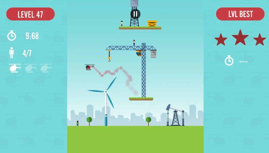 This game includes a level-based mode where you’re trying to rescue everyone onscreen and return to the helipad, and an endless mode where you’re trying to rescue people while escaping a constantly-rising ocean of water. There’s also a two-player competitive mode.