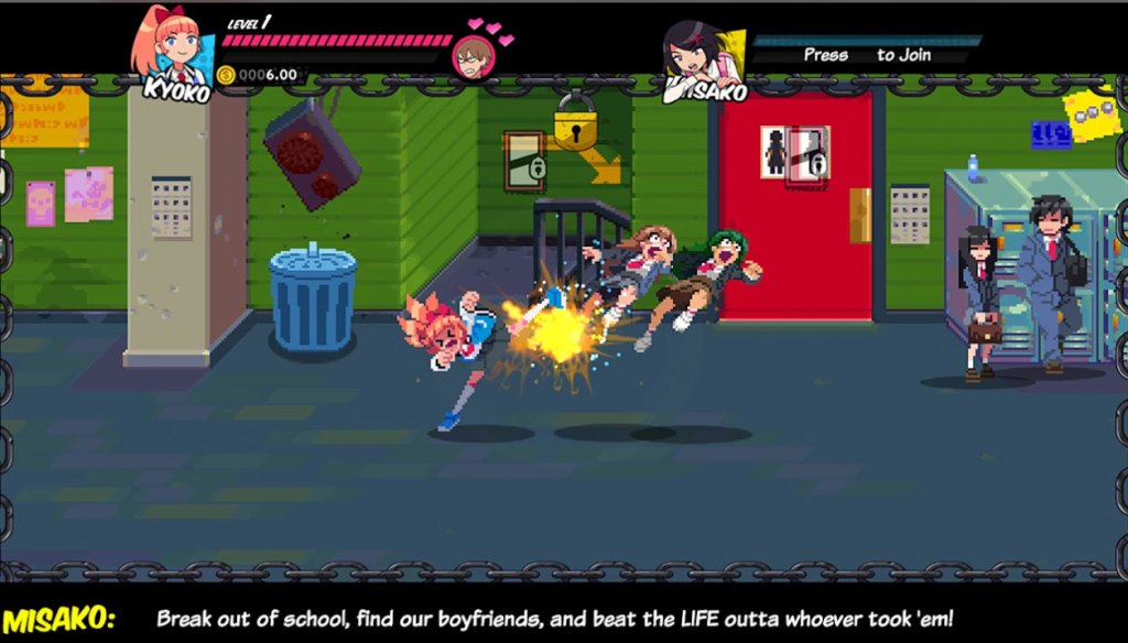 Regardless of which of these games you have and have not played, it’s fairly easy to quickly hop into River City Girls and pick up on the story and unusual anime vibe of the game. Players take the role of Misako and Kyoko, a pair of teenage girls who discover in a twist on the series’ usual trope that their boyfriends Kunio and Riki have been kidnapped. The two immediately decide to bust out of detention, ditch school, and fight their way through the city’s gangs to find and rescue their dudes in distress.