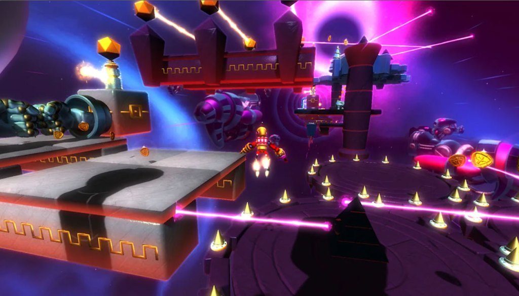 These game’s levels all take place on floating platforms suspended over an endless abyss, and the obstacles on platforms have overly-large hitboxes and can one-hit kill you, so it feels like this game is trying to make up for the low difficulty caused by its broken level design by compensating with a broken challenge level in its hazards. Suffice it to say, two wrongs don’t make a right here.