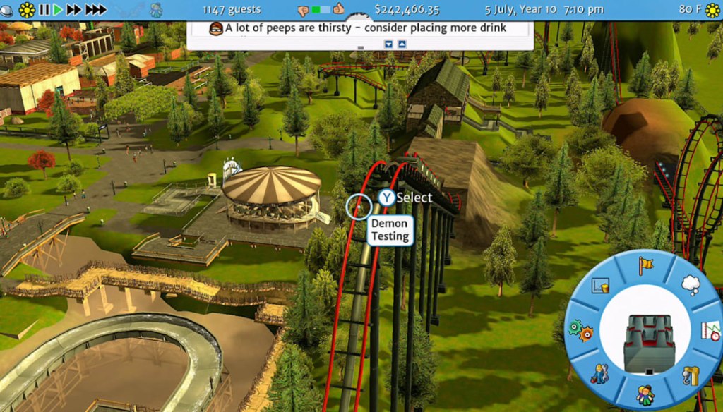 Park is losing money and you’re not sure why? Maybe there’s a menu explaining the dilemma, but good luck finding it. Forgot how to get to a certain menu? There’s no convenient reminder how to do so. I’ve played plenty of games in this genre, and I found myself flailing around to try to find out how to create simple paths. My problem? I needed to switch over to the creation menu using the L button and then hold down L and press B to back out to earlier creation menus. If the game explained this button combination, I must have missed it.