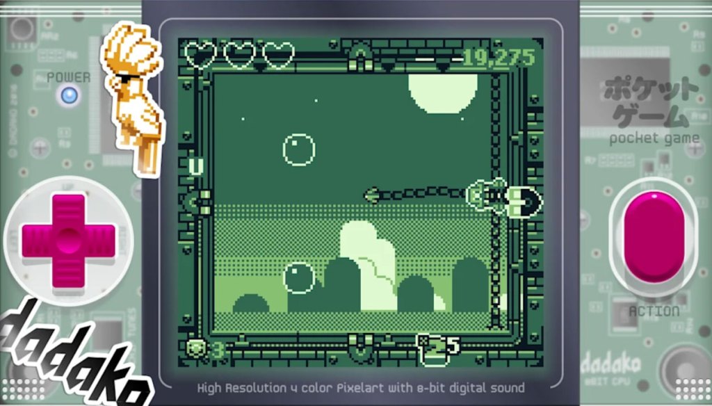 The presentation here may not appeal to everyone, but I give it credit for diving head-first into what it attempts to do here. This game’s four-color pixel art visuals and chiptune soundtrack perfectly capture that old-school Game Boy feel, and the game even uses a frame that imitates the look of a Game Boy-style device, complete with D-Pad and “Action” button that move in response to your inputs. What’s more, players can unlock different skins for each of these elements – different face plates, buttons, screen colors, and so on. For what amounts to a very simple game with a very simple presentation, this is a fun way to add in variety while remaining true to that simplicity.