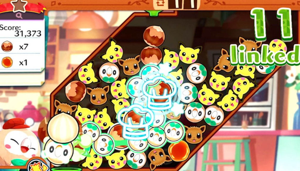 Pokemon Cafe Mix, released on the Nintendo Switch in 2020 and then re-released on the Nintendo Switch in 2021 as Pokemon Cafe ReMix, is a free-to-play Unlimited Pattern Puzzle that requires the touchscreen to play – this game cannot be played in docked mode. This game has a theme of preparing meals and drinks in a Pokemon cafe, but in reality what you’re really doing is connecting chains of icons that look like the faces of various Pokemon, hoping to move them around on the play field in a way that meets specific clear conditions.
