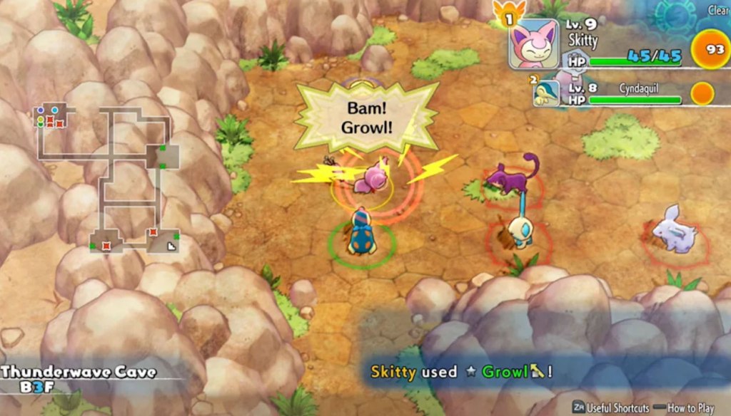 As for the gameplay, this is a game that combines the core gameplay and mechanics of the multi-franchise Mystery Dungeon series with some of the gameplay elements of the Pokemon series. From Mystery Dungeon series, you get a turn-based top-down RPG where enemies move and attack only when you move, and from the Pokemon games, you get a small team of characters with a limited move set of four elemental-based attacks, with a part of the strategy of the game being to use the correct attacks on the appropriate enemies.