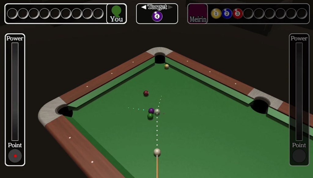 The presentation here is okay. It’s nothing special, but it works. The game’s 3D visuals have a largely untextured table (save for the wood grain at the edges), plain-looking balls, and a featureless room, paired with decent sound effects for hitting the balls, backed by uninspired piano and synthesized saxophone, and occasionally punctuated by canned clapping noises.