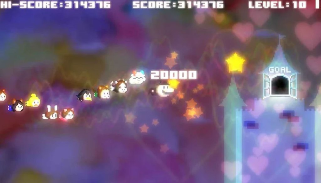 The presentation here is nice, even if it’s very silly and nonsensical. Characters are represented by pixel art 2D visuals, flying through backgrounds that look like bright colorful watercolor paintings overlaid with more pixel art. This is backed by a peppy soundtrack with jazzy vocals that fits the game’s love-obsessed (and vaguely French) theme, as well as gobbledygook voice effects for characters that help enhance the game’s silly nature.