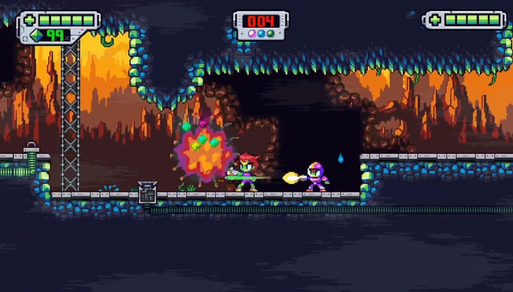 The presentation here is mostly good, with colorful 2D pixel art visuals reminiscent of a Mega Man game or a WayForward title backed by a decent but forgettable synthesized soundtrack. I should note that by default the sound in this game is wayyyyyy too quiet – you’ll want to adjust this in the settings.