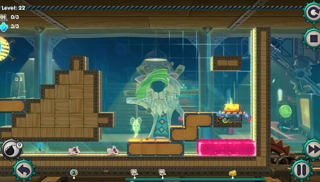 Mousecraft features a decent presentation where the centerpiece is the 3D model of an anthropomorphic cat scientist in the background watching over the maze. The cat is fairly detailed and pretty well-animated, and adds a lot of personality to the game. The rest of the game here looks good too, though not to the same extent, and the fact that all of the game’s visuals are pretty repetitive makes it lose some of its charm after a few levels. These visuals are accompanied by a plucky soundtrack that works well enough, but gets a bit annoying after a little while.