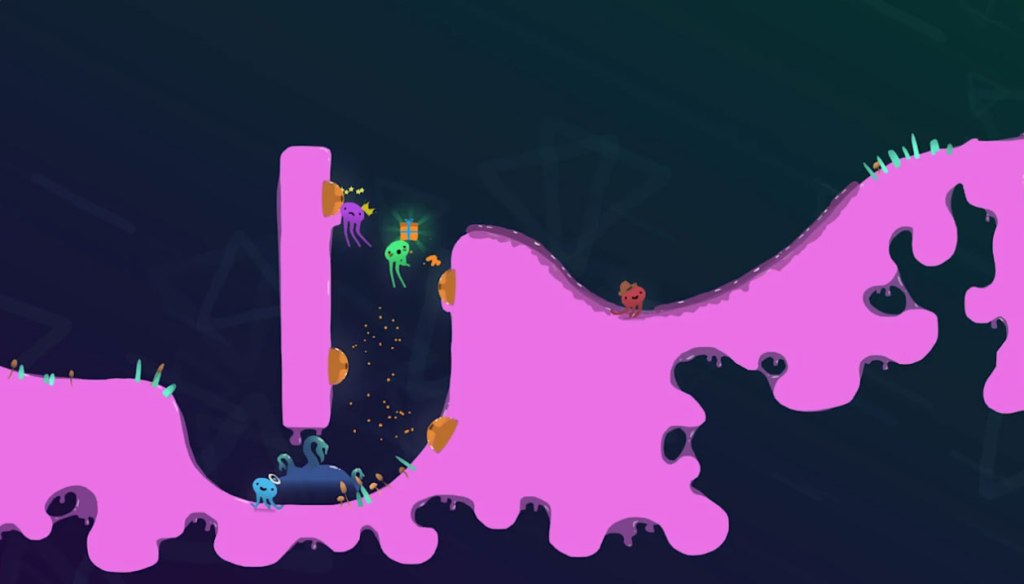 Muddledash is a Platformer/Party Game where two to four players play cartoony octopus-like creatures all in a mad race for the finish line, with the caveat that the winner will be whoever arrives there first carrying a gift that players will be squabbling over for the entire trip.