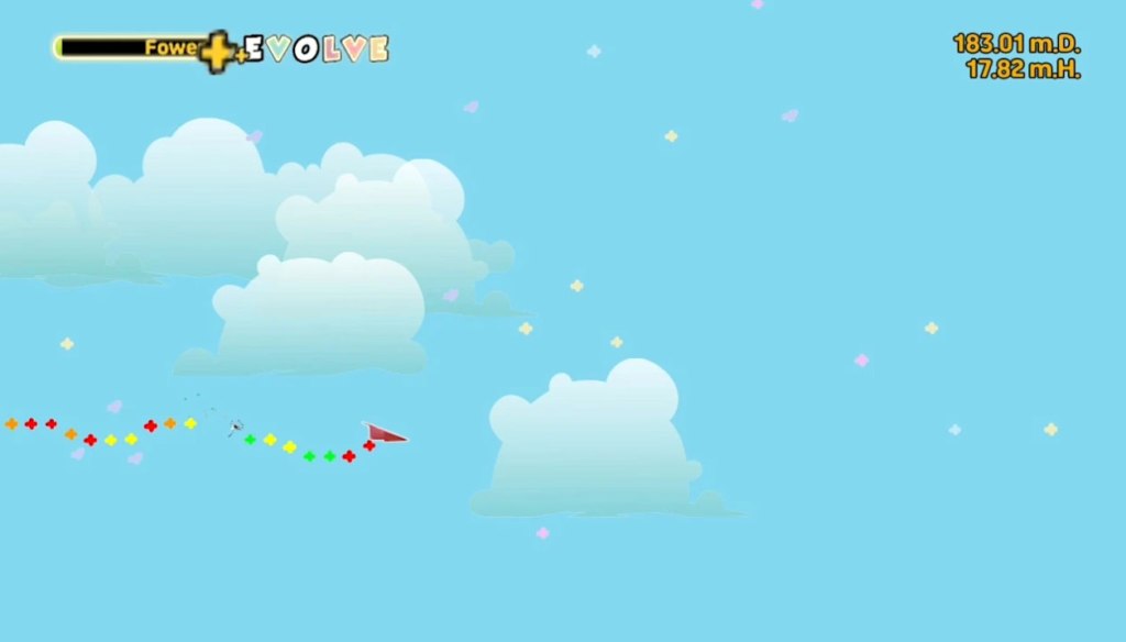 For the gameplay, players are largely concerned with expending energy – every tap of the A button uses up some, and when you’re out of energy you no longer have any ability to control your seed. Players can use plants growing out of the ground to bounce to get some more air time, they can replenish a little energy by touching multicolored flowers in the air (or are they small clouds? It’s difficult to tell), and can replenish a bit more by grabbing floating letters that spell out the word “evolve”. However, the main way players will refuel their metaphorical tank will be either by following behind a paper airplane that drops a trail of flowers to absorb, or colliding with an animal, which will carry your seed some distance and completely replenish your meter.