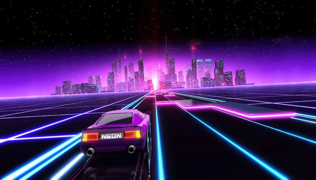 Neon Drive is a Music-Rhythm game with Arcade Racing elements where players drive a car on an abstract 80s-style neon highway and must dodge obstacles, often to the timing of the game’s music. This game was first released in 2015 on mobile devices, and later ported to other platforms, making its way to the Nintendo Switch in 2019.