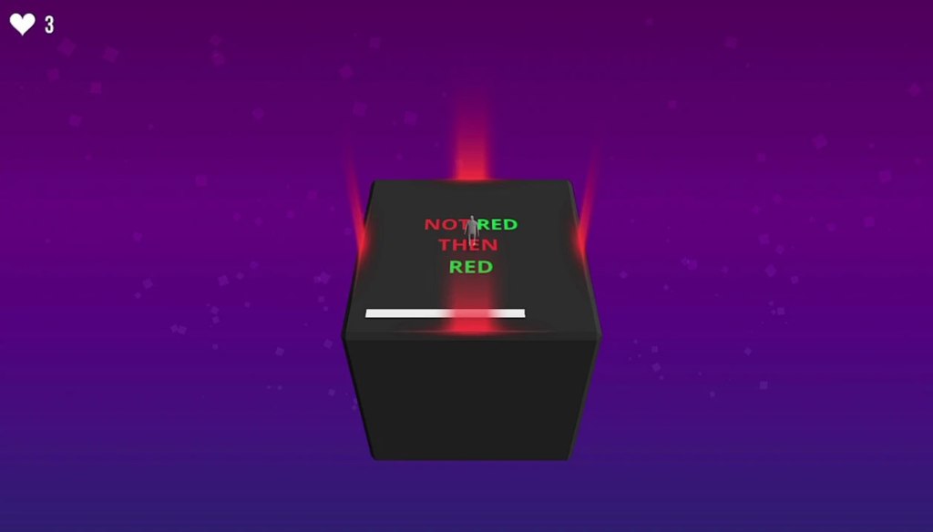 Not Not is a “Mental Exercise” style game in the same vein as games like Brain Age. In it, your character stands atop a cube with an instruction printed on its face and four white or colored places to move to on each side. All you need to do is follow the instruction by moving the character up, down, left, right, or staying still within the span of a few seconds on a ticking timer. Respond correctly and you get a new command. Respond wrong, and you lose one of your lives/chances.