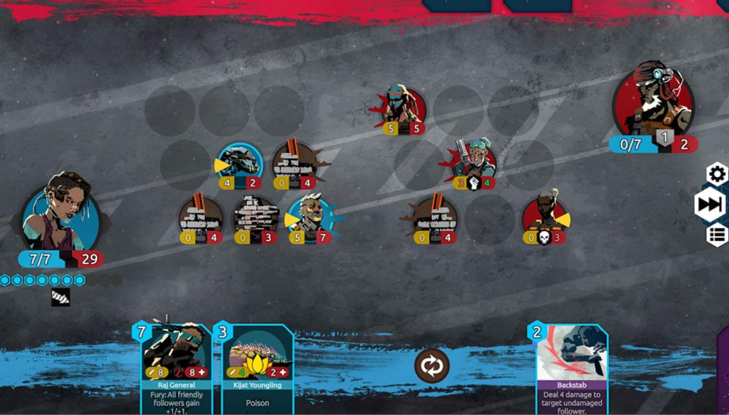 Nowhere Prophet takes an interesting approach to weeding out the weak cards from your deck, though. When your various minions get defeated in battle, they gain a “wound” that leaves them less powerful in subsequent battles (but also less expensive to summon). If a wounded unit gets defeated, they’re permanently killed and eliminated from your deck. On the other hand, if they manage to land the final blow on an opponent, they heal their damage and gain a “blessing” that makes them super-powerful.