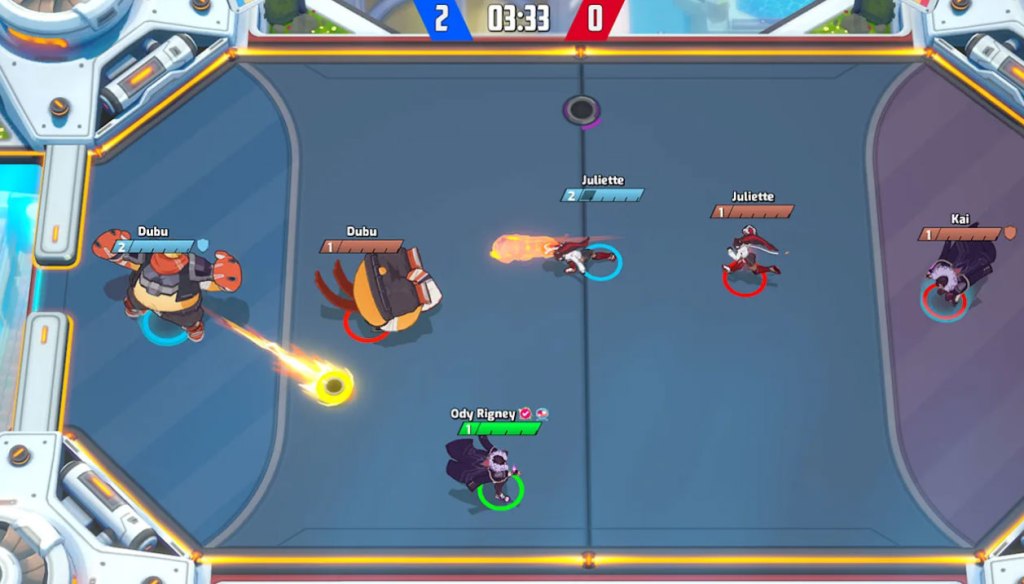 As for the gameplay, Omega Strikers is okay, with characters able to attack the disc and other players using different abilities that run on separate cooldowns. There’s a selection of different characters, but no matter who you choose, the gameplay kinda’ feels like a frenetic dogpile, and unfortunately the walk speed is so slow you’ll likely be frustrated when you character is struggling to get to the disc like they’re walking through molasses.