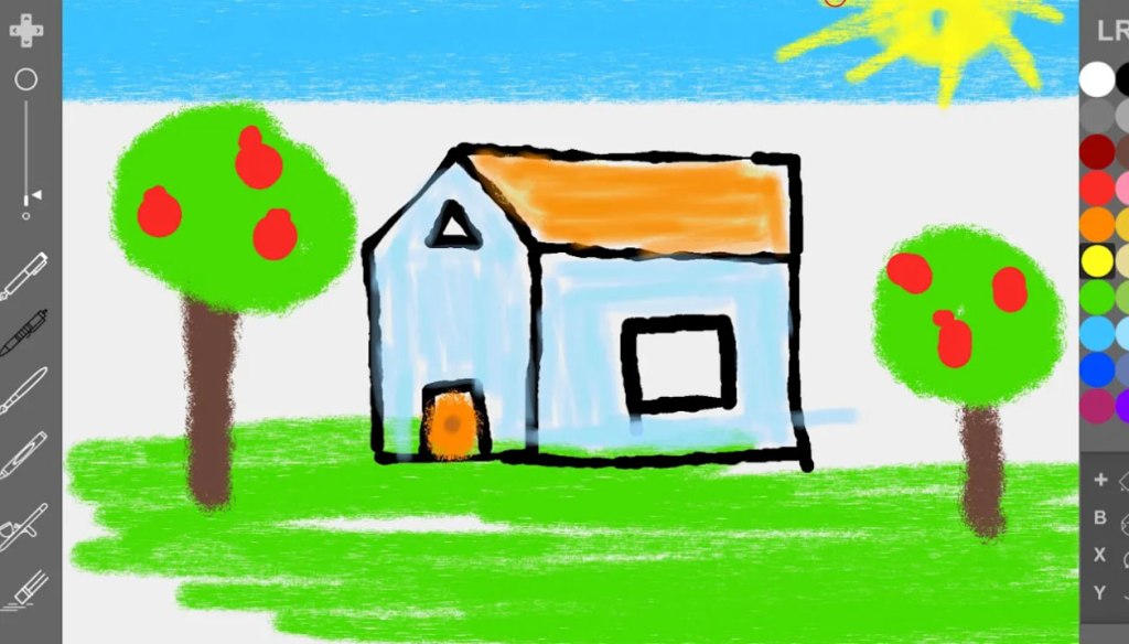 Players can select one of six brush styles with adjustable sizes, 20 colors, there’s “undo” and “redo” buttons, and an “erase all” button and that’s it. No ability to save or share your works (beyond taking a screen grab), and in fact if you accidentally exit out to the menu (which is done with a simple press of the plus or minus buttons), you lose whatever you’re working on instantly.