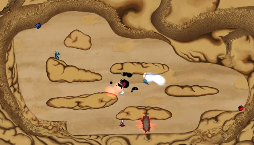 The presentation here is a bit difficult to describe. The game seems to start off with the intention of everything in the game taking place in books with stick figures fighting using pencils, ink, and scissors. However, between all the odd level designs and the wide assortment of guest characters, this visual style seems to have gotten lost at some point. This would have been fine if not for the fact that the visual style we’ve been left with can make it difficult at times to make out where your character is in all of the chaos and confusion of battle, especially when bits and pieces are flying all around the arenas. The music here seems similarly confused – it’s not bad, but the dramatic orchestral pieces the game uses seem to shout that this is a serious fantasy epic instead of a silly arena fighting game.