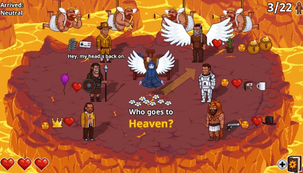 These criteria start fairly simple – angels go to heaven, demons go to hell. But gradually more rules start getting added to the mix. Humans and minotaurs are neutral, and by default they go to purgatory. However, characters can have “good” or “bad” symbols that can change their balance to push them towards heaven or hell. However, angels, demons, and minotaurs (the latter being from purgatory) can always be sent to their natural home if you don’t want to bother adding up their symbols.