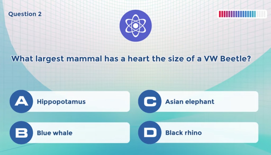 The presentation here is very simple, just showing the words for each question, and with a violin-led soundtrack comparable to the game show Who Wants to Be a Millionaire. It’s not at all impressive, but it works, I suppose.